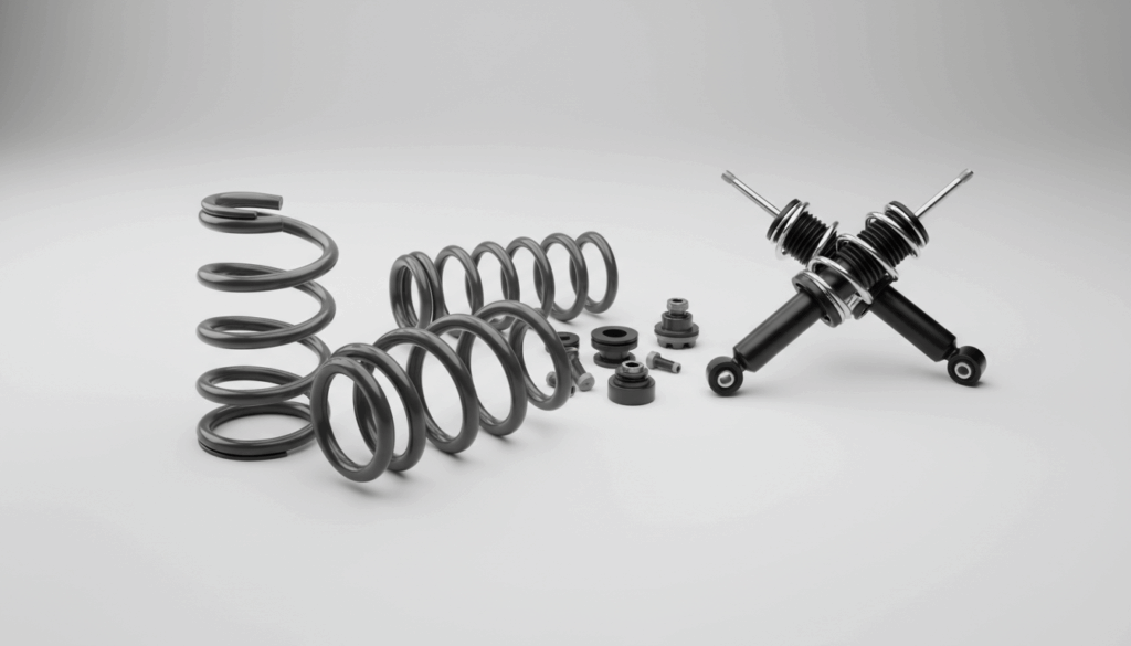 Typiske produkter inkluderer forfjeder, bagfjeder og dmper i enkeltst e5ende enheder eller i s, der giver bedre vejkontakt, stabilitet og kontrol i sving og ved acceleration. Der findes ogs e5 specialdmper og forskellige variationer, der passer til forskellige modeller og k f6rselsbehov.