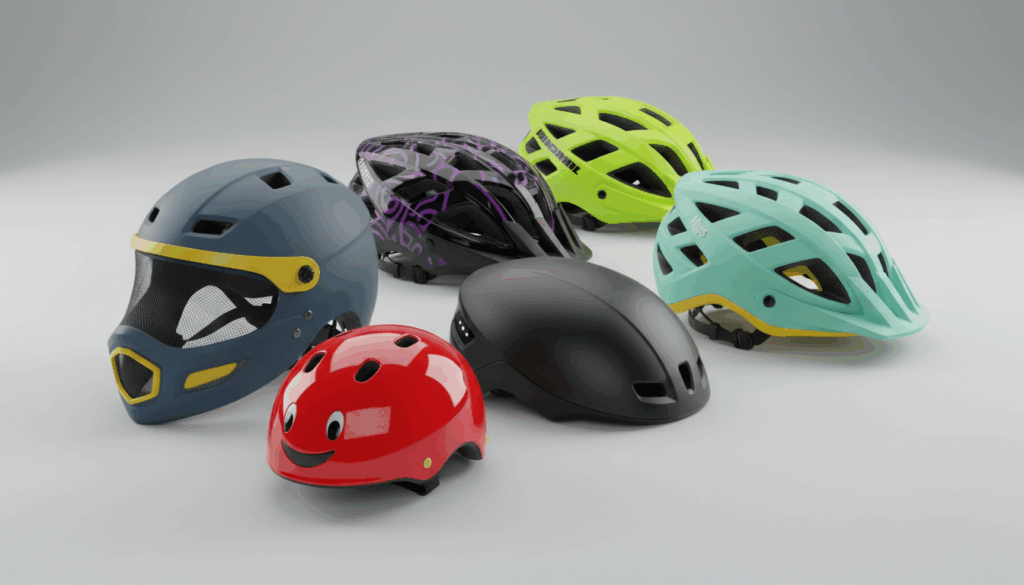 Når du vælger, mål hovedomkreds og tænk over anvendelsen: daglig pendling, terræn eller kørsel i byen. Overvej vægt, ventilation og, hvis relevant, visir, visuel synlighed og størrelse. Børn har brug for robuste justeringer og tydelig synlighed, så sikkerheden er i fokus.