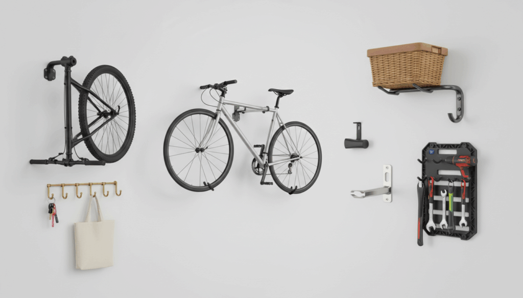 Eksempler i sortimentet omfatter vægophæng til cykler og frontkroge. Se inspiration hos Cykelpartner.dk og Easy-light.